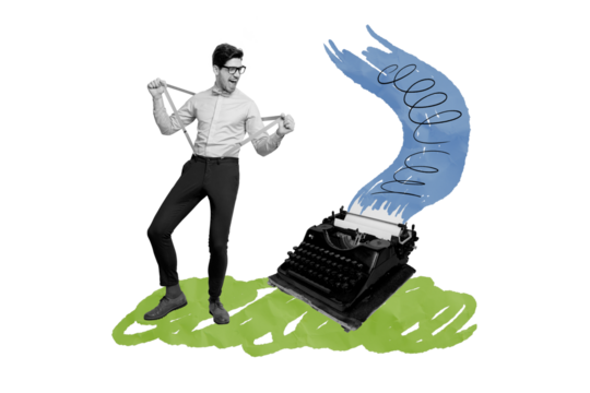 Composite trend artwork sketch image photo collage of monochrome student young guy stand model posing typewrite machine author writer book
