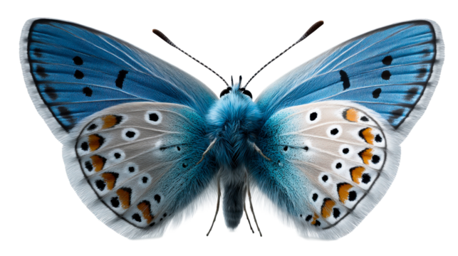 Stunning blue and white butterfly with intricate wing patterns and vibrant orange and black markings captured in highresolution detail, perfect for scientific studies and naturethemed