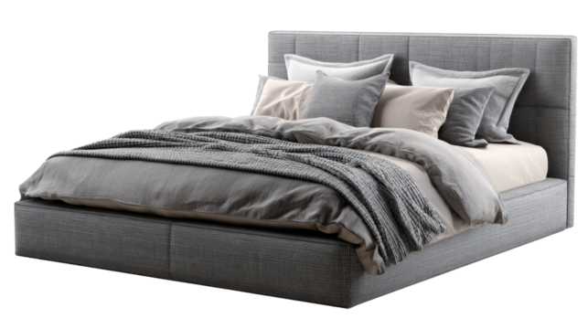 A light gray sofa with a wooden base and several decorative pillows against a black background studio shot on transparent background