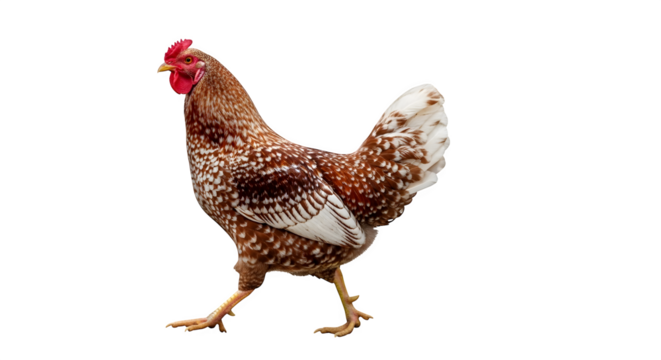 Speckled sussex chicken walking in a studio setting