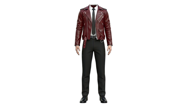 Men's Burgundy Leather Biker Jacket with Black Trousers and Studded Belt