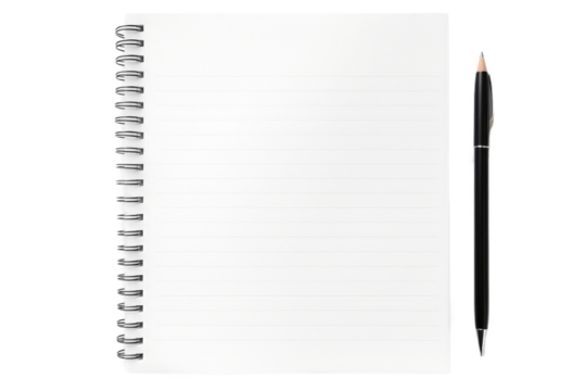A photo of a notebook with a pen resting on top of it, depicting a work or study environment. on a White or Clear Surface PNG Transparent Background.