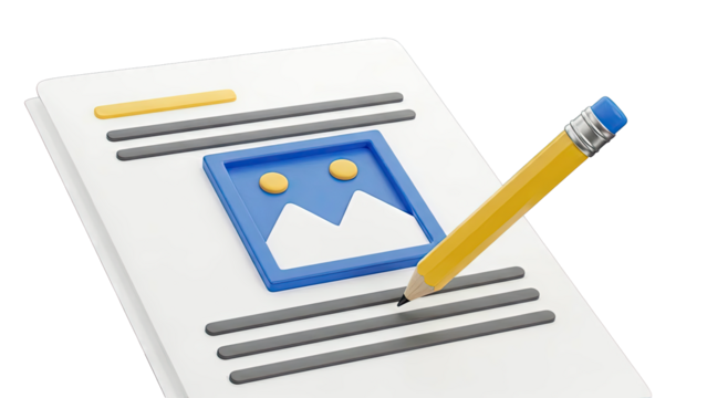 3D Illustration of Document with Image Placeholder and Pencil