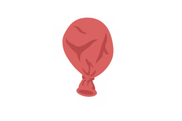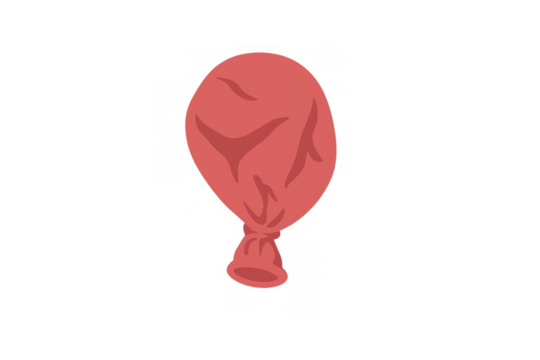 Red deflated balloon. Crumpling rubber object feeling old, empty, and experiencing an ending, on transparent background