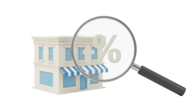 Storefront with percentage sign in magnifying glass isolated PNG, retail business concept for sales and discounts on transparent background