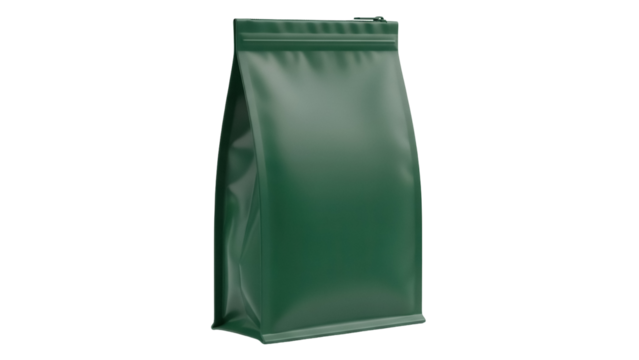 Dark green stand-up pouch isolated PNG, blank flexible packaging for food or coffee on transparent background, mockup template