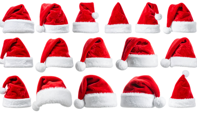 A vibrant collection of festive red and white holiday hats, showcasing various styles and angles for seasonal celebrations