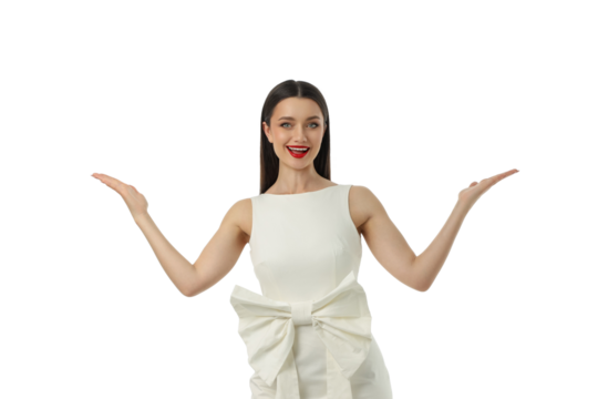 Smiling woman in stylish polka dot dress wearing glasses with transparent background