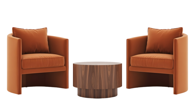 Modern living room furniture arrangement with stylish terracotta armchairs and sleek wood coffee table against a clean dark backdrop for home decor ads