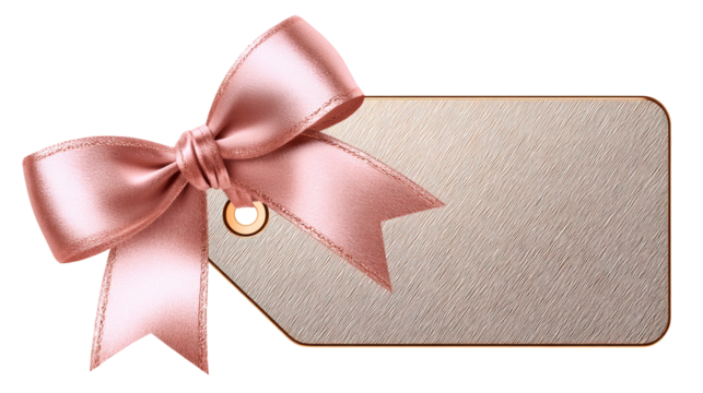 Elegant pale pink satin bow tied to a textured rectangular gift tag with a metallic gold eyelet, perfect for luxury packaging, branding, or special occasion announcements.