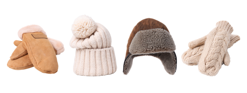 Neutral winter hats and gloves collection, isolated, PNG