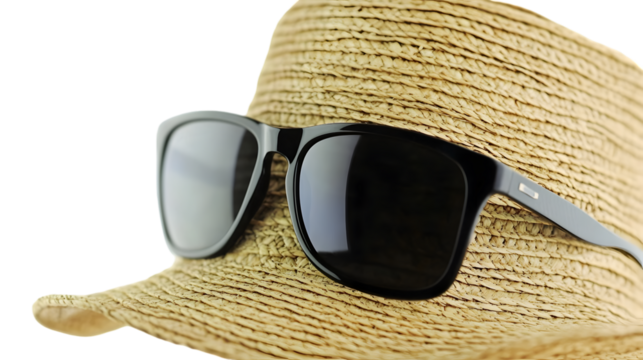 Sunglasses resting on a stylish straw hat isolated on transparent background
