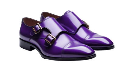 A pair of stylish purple leather dress shoes with double buckle straps, isolated on a clean transparent background.