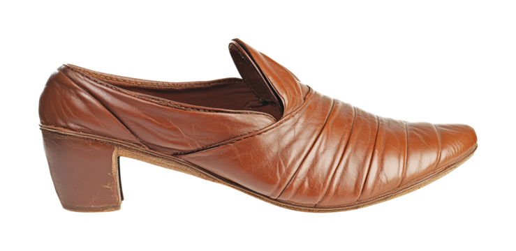 Vintage brown leather shoe with a low heel and pleated design, perfect for retro fashion enthusiasts, cut out