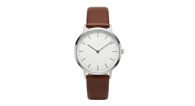 A close up of a wristwatch with a white face and a light brown leather strap on a on transparent background