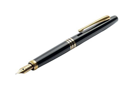 Stylish black fountain black pen isolated on cut out PNG or transparent background. Fountain pen is that can hold ink in cartridge. Realistic equipment stationery template pattern.