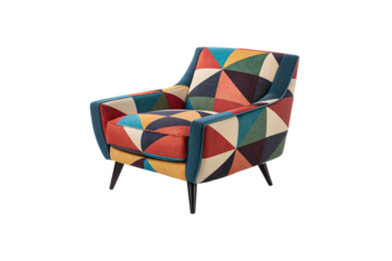 A vibrant armchair with a patchwork geometric pattern in red, blue, yellow, and green. Its modern design, curved armrests, isolated on a transparent background