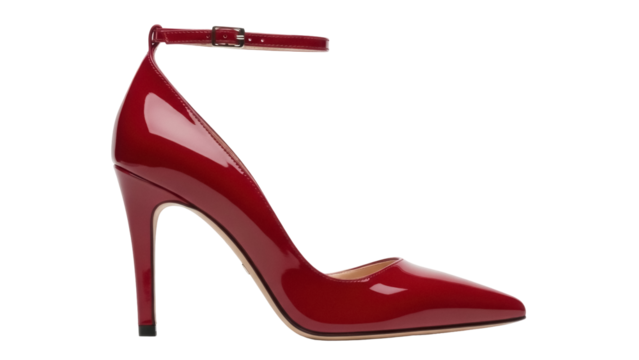 Isolated high-heeled stiletto pump shoe in shiny patent leather, ankle strap fastener