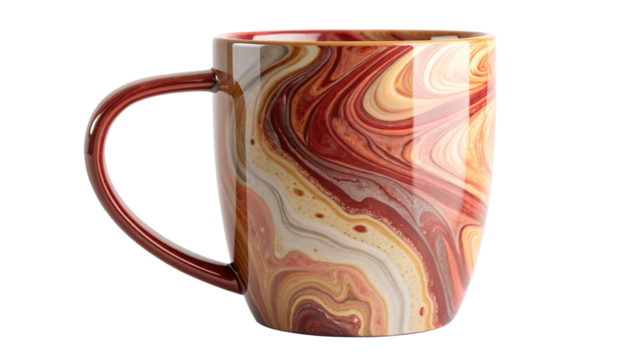 Ceramic coffee mug featuring a rich glossy marbled design in warm tones of red brown and cream for product display on transparent background