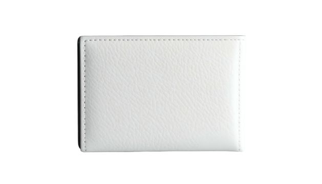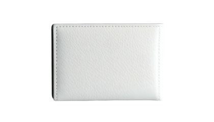A close-up, isolated shot of a rectangular, white leather cardholder on a solid black background. The cardholder is meticulously stitched