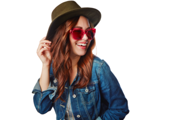 Woman with smile, gen z fashion and sunglasses, happy and excited with retro style isolated on transparent png background. Happiness, cool and young female fashionista with funky stylish clothes