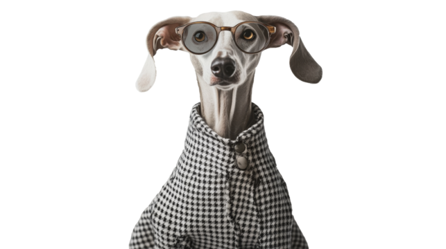Dog in heart-shaped glasses poses stylishly in modern indoor setting for a trendy photo shoot