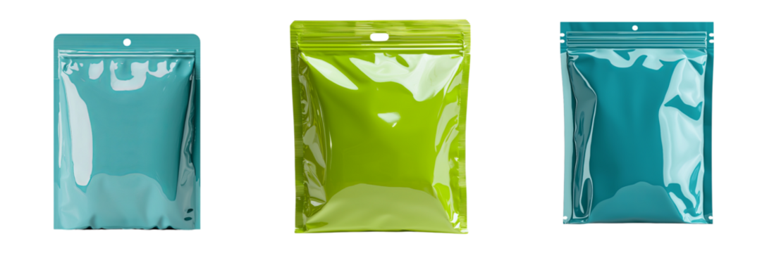 Png of Three vibrant, glossy packaging bags in turquoise and lime green, perfect for showcasing products stylishly.