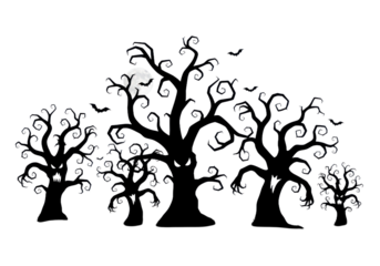 Spooky, stylized trees and bats against a dark background with a full moon.