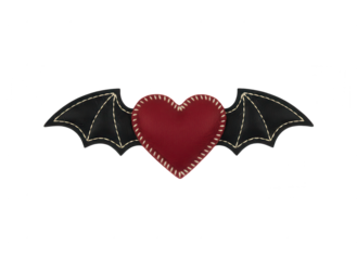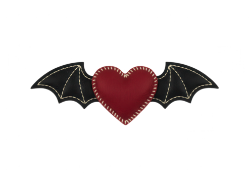 A neon green bat holding a pink heart pierced by a bone arrow is illustrated in a cute spooky-cute style with bold purple outlines and grunge splatter textures.