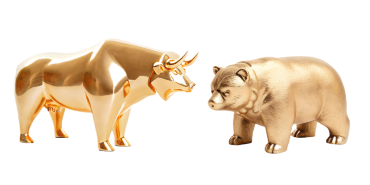 Golden bull and bear figurines facing each other on white isolated on a transparent background