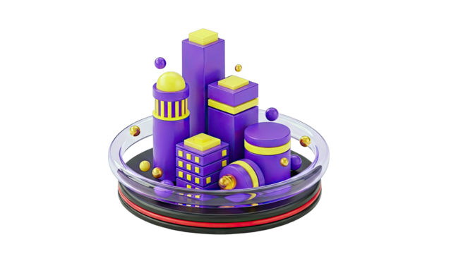 Abstract 3D Cityscape with Purple and Yellow Geometric Shapes