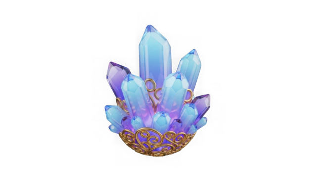 A vibrant cluster of glowing crystals enclosed in a golden ornate basket perfect for fantasy designs on transparent background