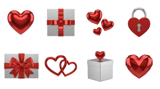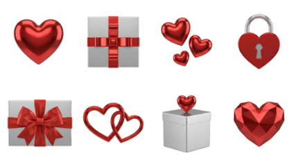 Romantic Love Collection featuring Hearts Gift Boxes Padlock and Rings in Glossy Metallic Style