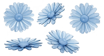 Five translucent blue daisy flowers are isolated on white displaying various perspectives Ideal for spring or natural design concepts