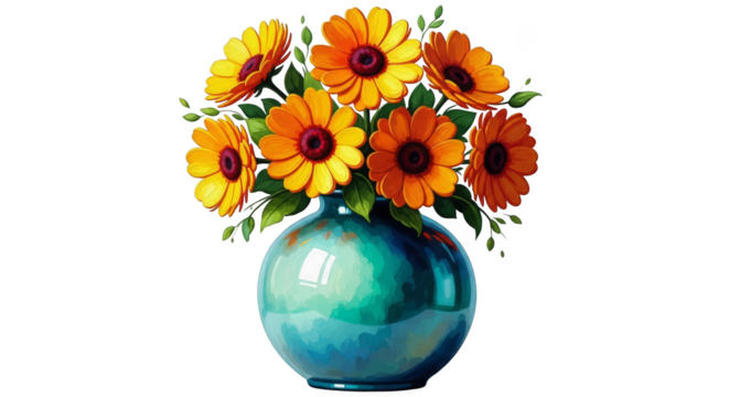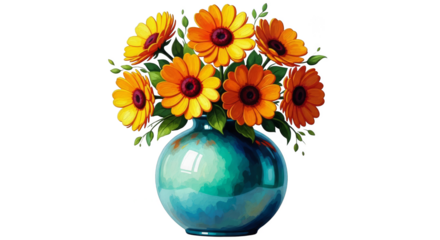 Stylized 3d yellow daisy featuring vibrant orange center, white stem and delicate leaves against transparent backdrop