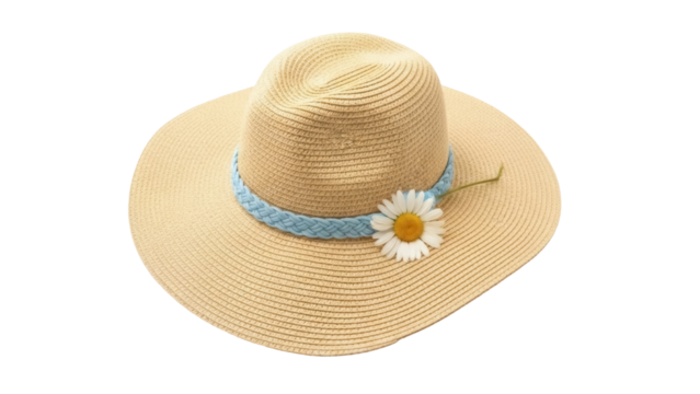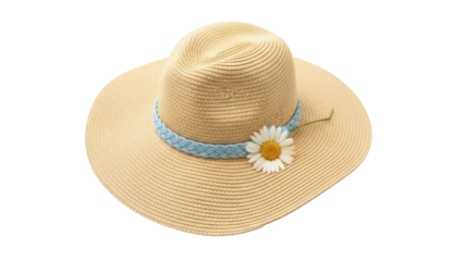 Isolated straw hat with a daisy flower and a blue braided trim, elegant summer headwear