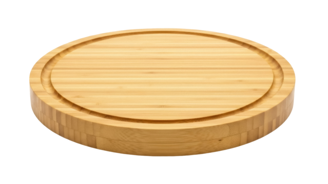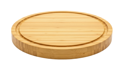 Isolated wooden round cutting board, grooved edge for draining liquids, elegant serving platter