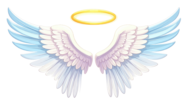 Cartoon illustration featuring a pair of large, stylized angelic wings with detailed feather rendering and a golden halo above