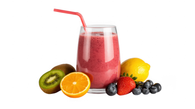 Fresh fruit smoothie with straw and fruits isolated on a transparent background glass