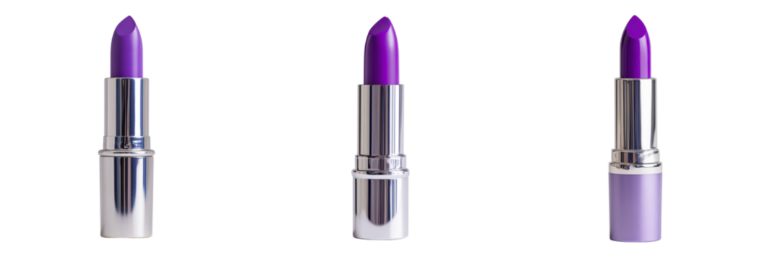 Three stacked rectangular cosmetic lip glosses in shades of pink purple red and grey with shiny metallic casings isolated on transparent background