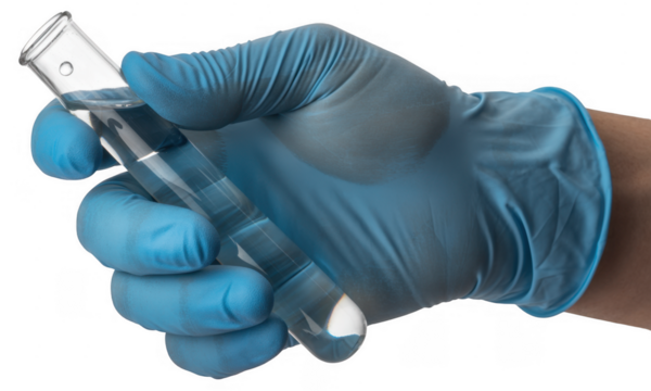 Hand in blue glove holding test tube isolated on a transparent background