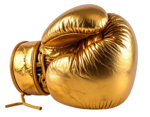 Close-up view of a gold boxing glove with intricate details, isolated on a transparent background