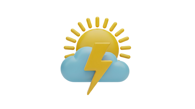 3D Weather Icon: Sun Behind Cloud with Lightning Bolt