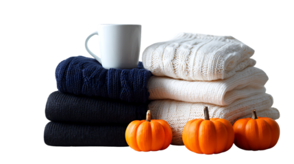 Cozy autumn sweaters, mug, and pumpkins isolated on transparent background