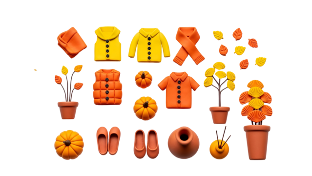 A collection of stylized autumn essentials including clothing, pumpkins, and plants