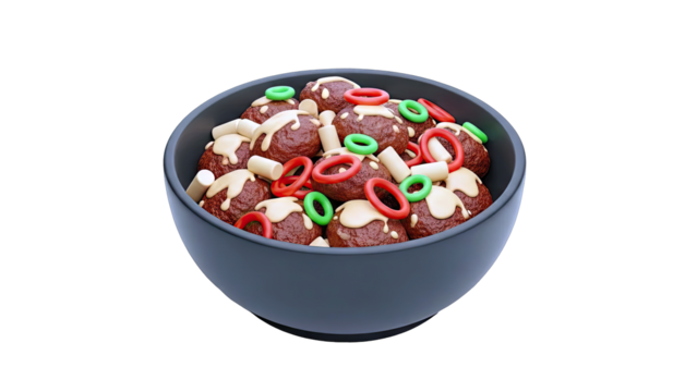 Stylized Meatballs with Sauce and Ring Toppings in a Bowl
