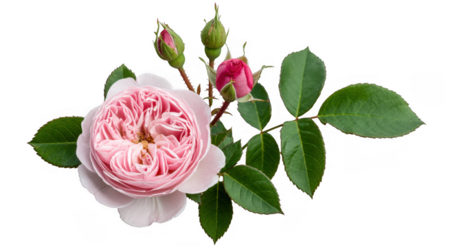 Pink rose with green leaves flower isolated on a transparent background