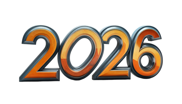 Bold, 3D rendered "2026" in orange and silver against a black background