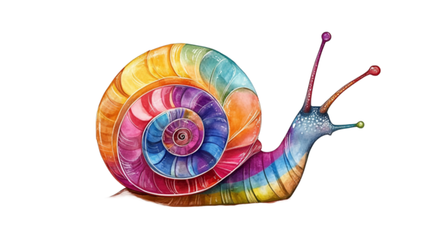 A cartoon style snail with a colorful, isolated on white background