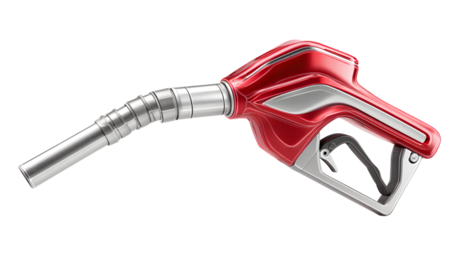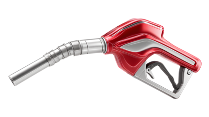 A stylized red and silver gas pump nozzle handle on a white background, featuring a matte red finish with metallic silver details